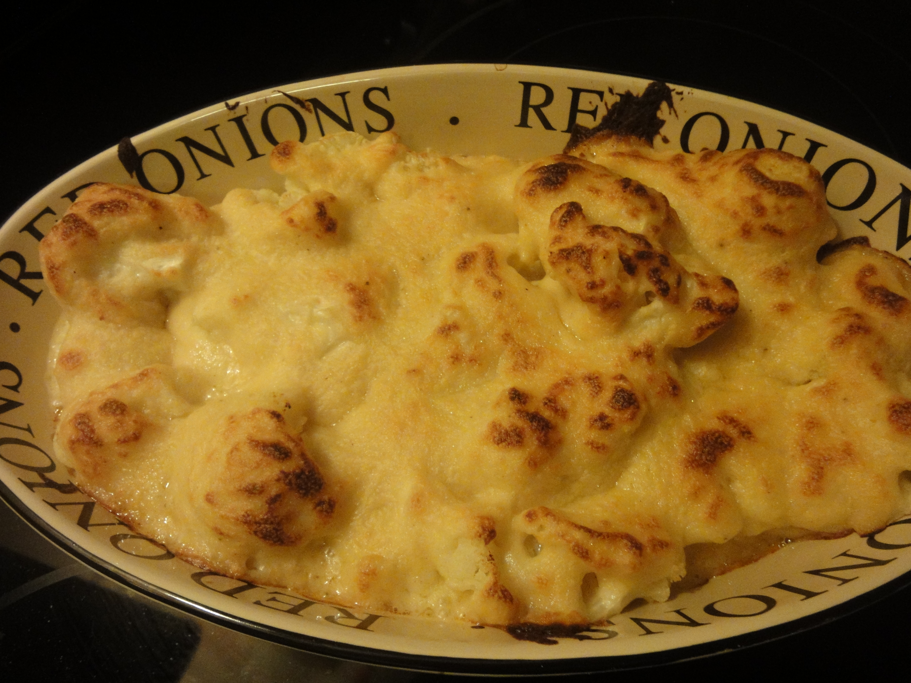 Sprinkle in the 3 cups grated cheese and stir over heat until it has melted into the sauce. Pour the sauce over the cauliflower in the dish, and scatter remaining cheese over the top. Cook for 20 minutes or until the cauliflower is hot and bubbly and the cheese has browned slightly on the top.