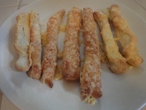 Now I’ve blogged before about my un-Martha-esque (or un-Nigella-esque, or un-Gordon-esque, or un-Jamie-esque) comfort level in the kitchen, but thanks to the invention of frozen puff pastry, cheese straws are one item that I can make in a mad dash, while simultaneously juggling a half a dozen other tasks.