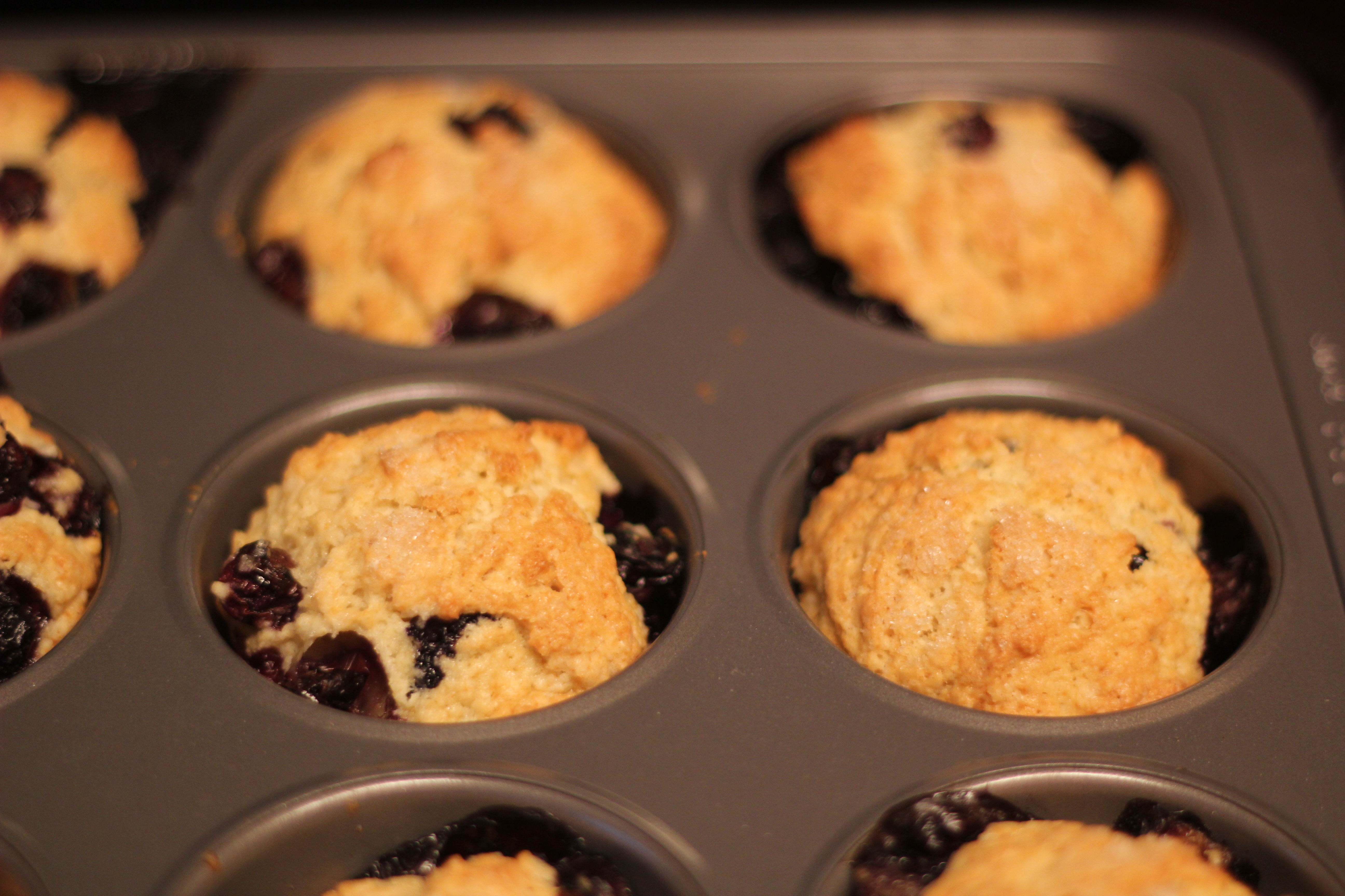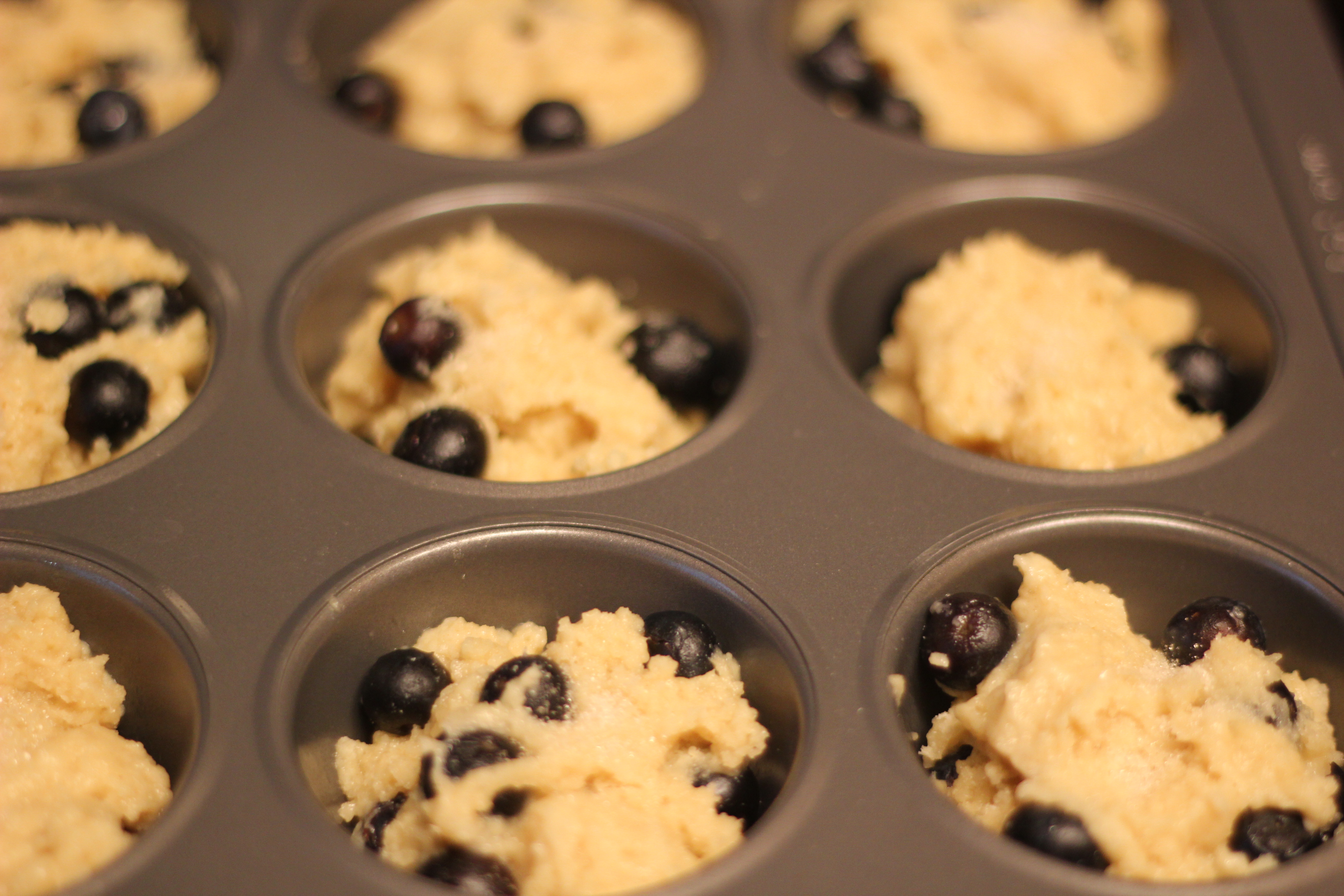 It’s a basic muffin recipe. You mix dry ingredients in one bowl. Wet ingredients in another bowl. Mix them together and then fold in the blueberries. It was straightforward, except the results were more like a drop scone batter than a cake batter.