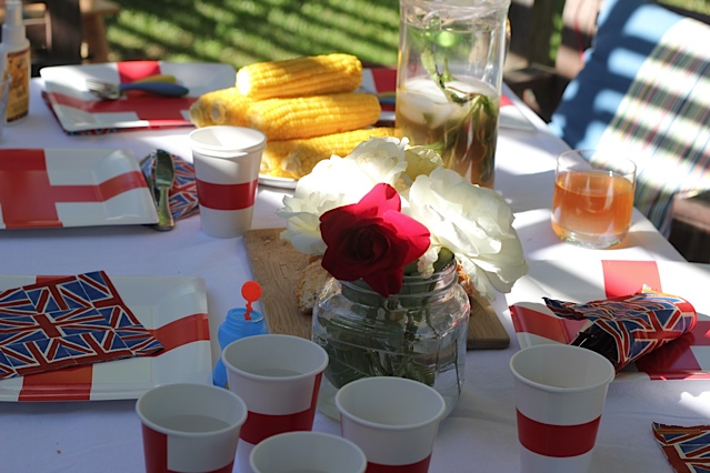 We ended up celebrating yesterday with some friends. We hung our union jack bunting up on the front of our house and threw together an impromptu barbecue dinner of grilled rack of lamb with mint sauce, boiled new potatoes, corn on the cob, macaroni and cheese (for the kids), strawberries and freshly whipped cream and a homemade berry pie from Taylor’s Market for pudding – all served with some union jack napkins and St. George’s flag plates, cups and even balloons (I know, I know, St. George’s flag is only representative of England, but we bought them cheaply on our last trip to the U.K. around the time of St. George’s Day and it worked in a pinch – at least more appropriate than this tableware.).