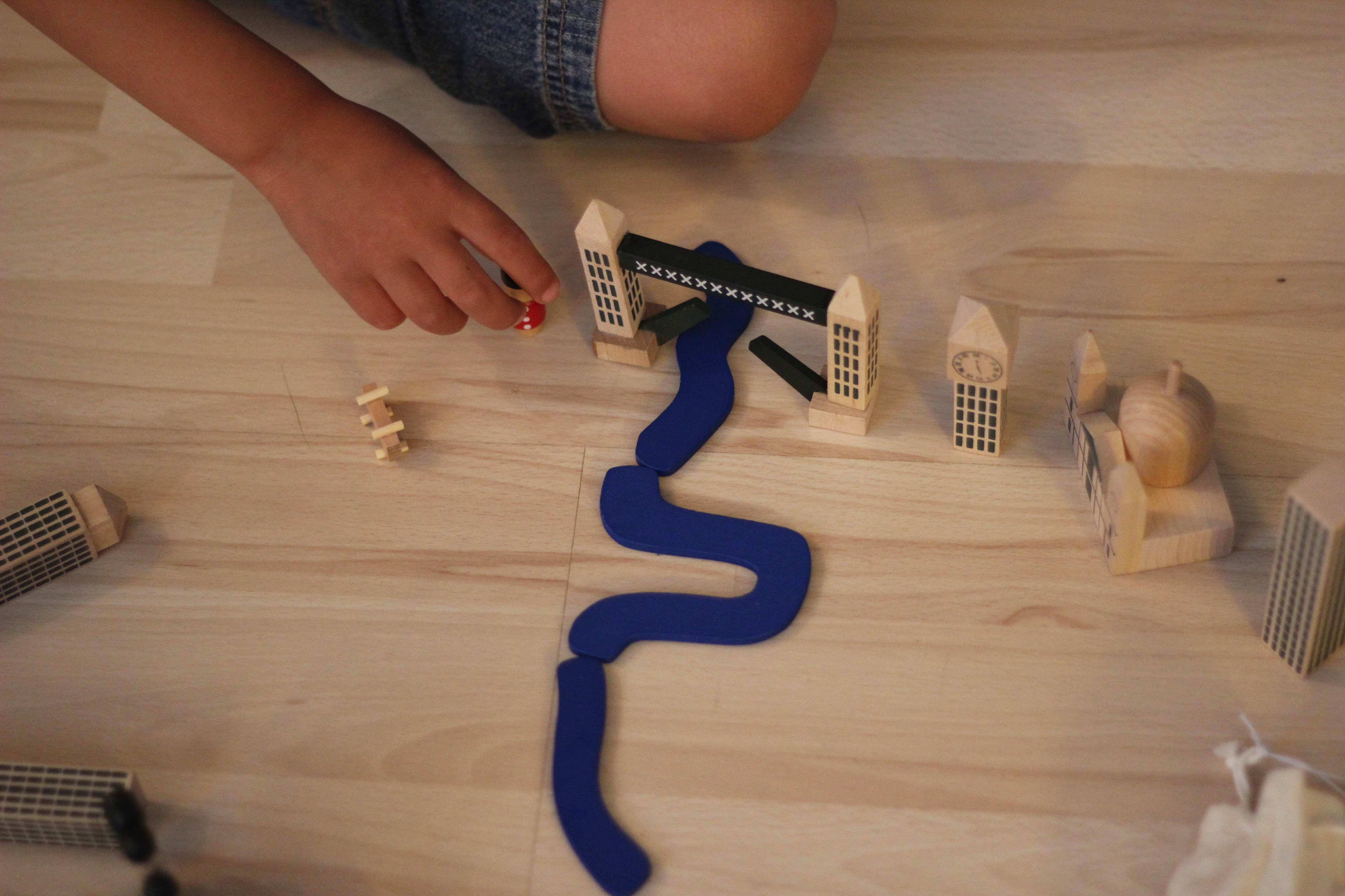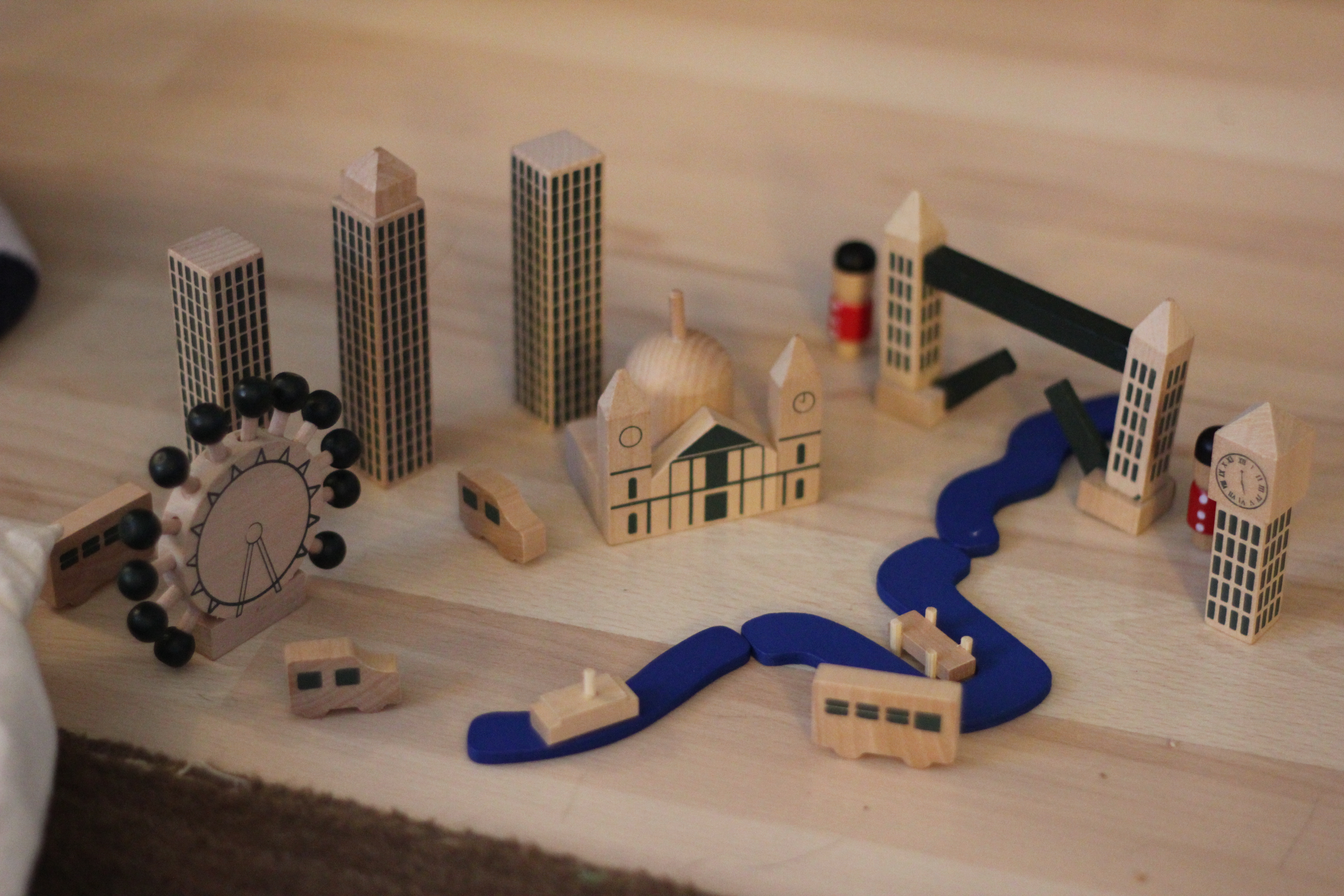 My MIL sent over this sweet wooden collection called “London in a Bag” last week for the kids and they have loved it. The river has been the thing they’ve been fighting over – who knew the Thames would be so popular? I say there’s plenty of London to go around from the mini version of the London Eye to the Tower Bridge. I’ve been trying to locate it online and there are other versions of the London in a Bag but nothing quite like this collection…