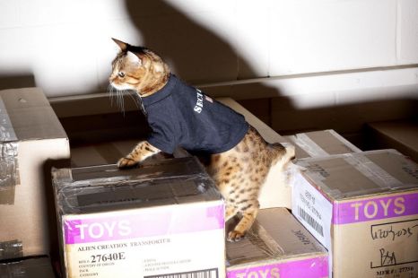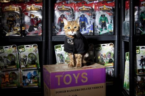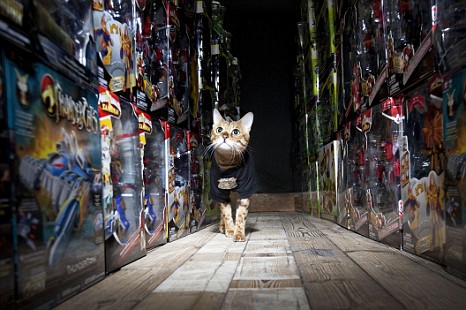 The toys in the warehouse of UK-based toy company Bandai are now safely being protected by Millie the cat. The story has been reported in several UK newspapers and I thought it was some sort of April Fools-style joke, but no. Behold, Millie! She’s not only the security detail at Bandai but ridiculously photogenic and looks adorable in cat clothes.